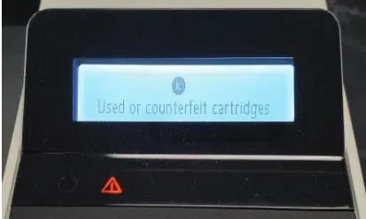 When you first install the cartridge, you will see the message, “Used or counterfeit cartridges”.