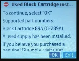 When you first install the cartridge, you will see the message, “Used Cartridges”.